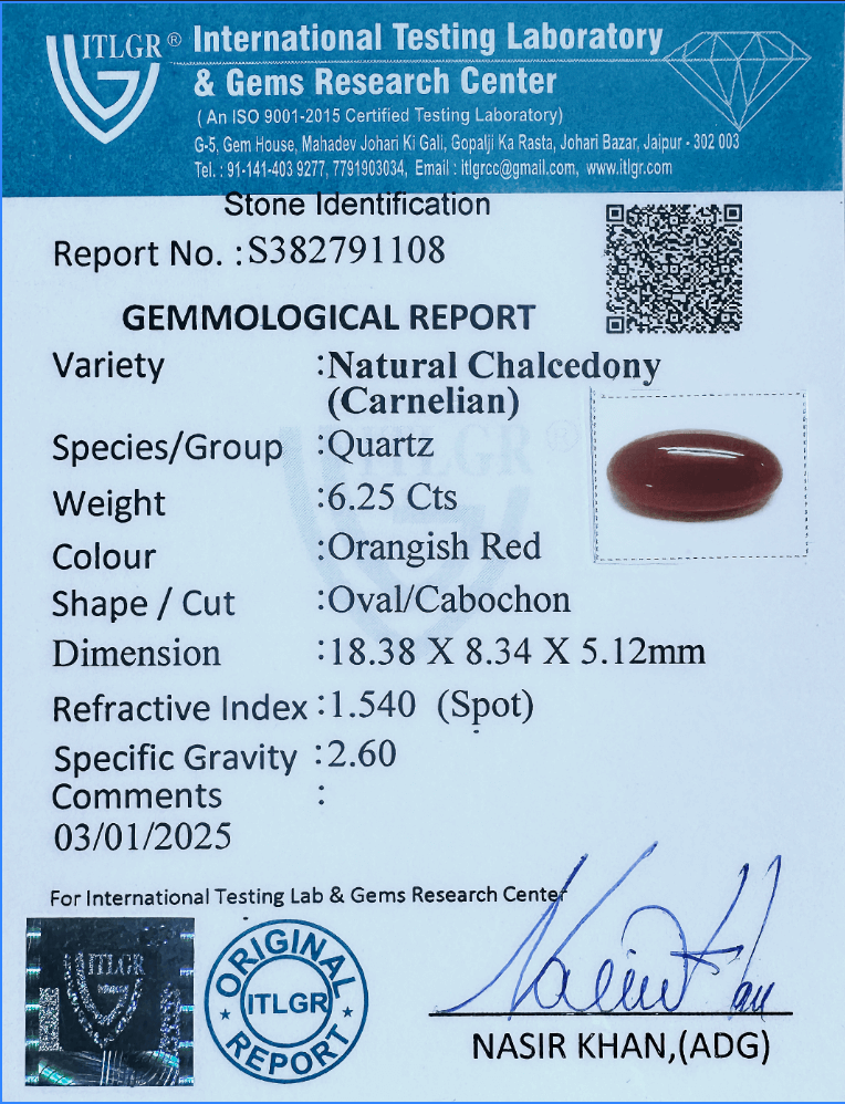 Authenticated by the International Testing Laboratory & Gems Research Center (ITLGR), this certification confirms that your Carnelian is a 100% natural Chalcedony Quartz, tested and verified for:
