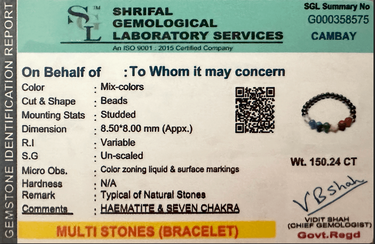 Authenticated by Shrifal Gemological Laboratory Services (SGL) — an ISO-certified and government-registered testing facility. This report verifies that the gemstones used in your 7-Chakra Bracelet are 100% natural and untreated.